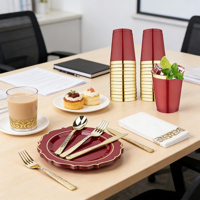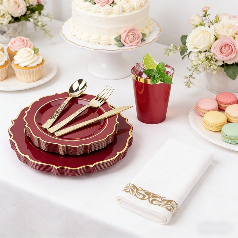 All-in-one disposable tableware set includes plates, cups, cutlery and napkins, fully meeting dining needs for weddings, parties and banquets.