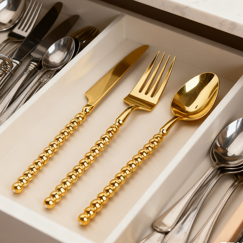 GoldProduct Configuration: Complete disposable cutlery set including knife, fork, and spoon, made of high-quality PS (polystyrene) material. Food-safe and compliant with international food contact standards.