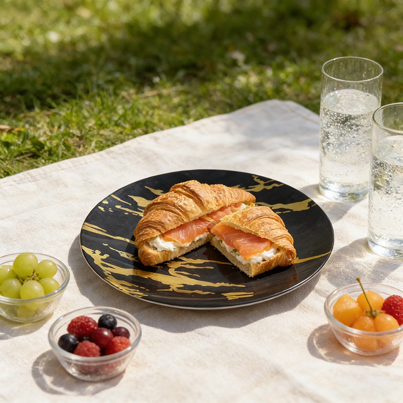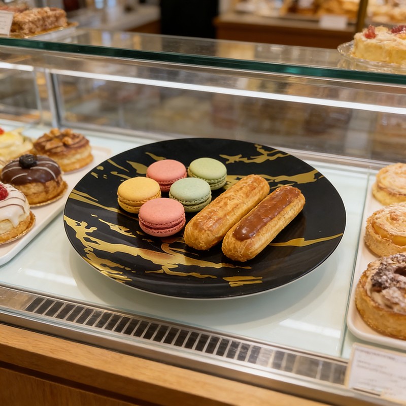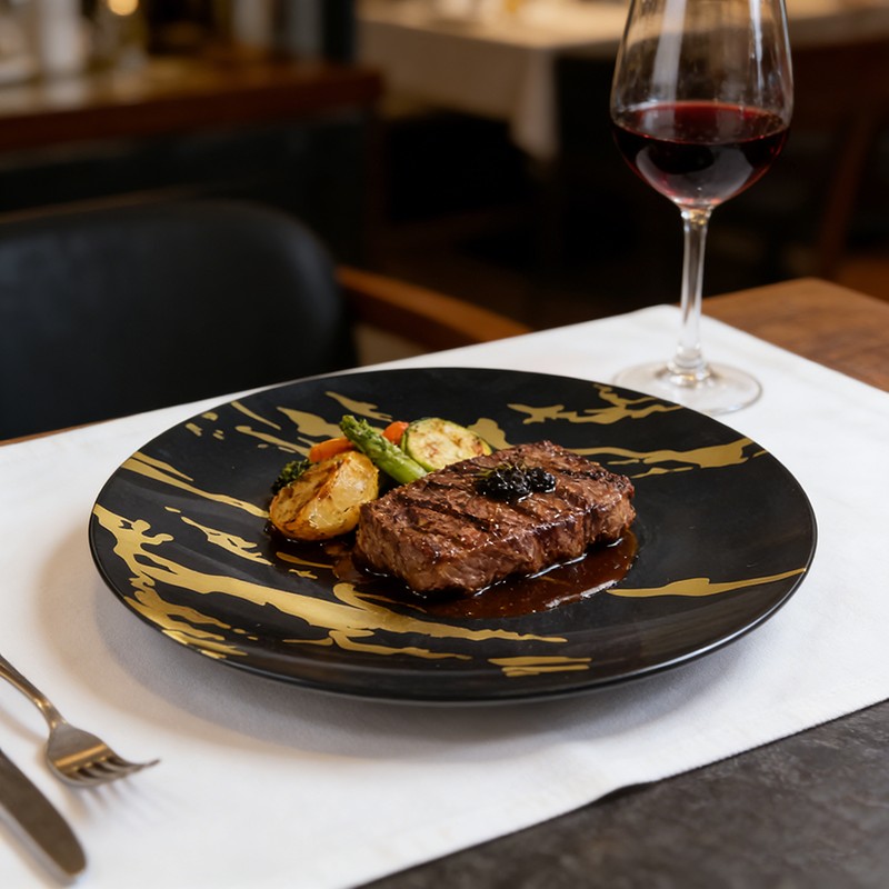 Os veios dourados e fluidos do mármore, contrastando com a base preta brilhante, criam um visual luxuoso e contemporâneo que remete à elegância das louças de pedra. Ideais para casamentos sofisticados, banquetes corporativos e festas de fim de ano, esses pratos elevam instantaneamente a decoração de qualquer mesa e combinam perfeitamente com talheres metálicos e guardanapos de linho.