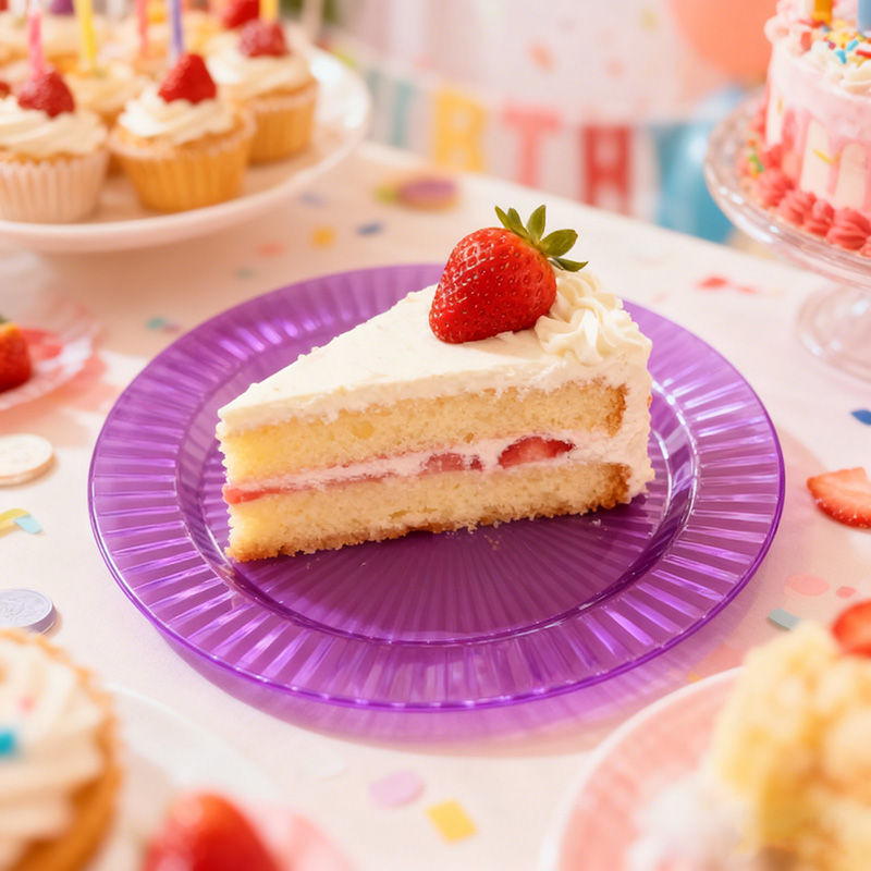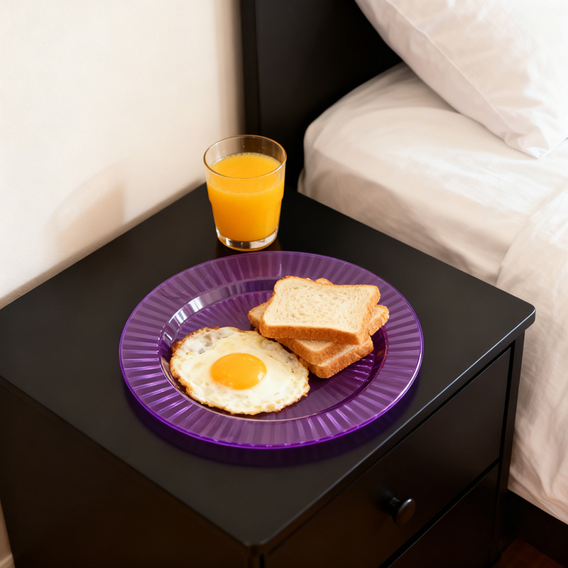 17.8 cm, 25.4 cmEspecificações principais e material seguroConjunto de pratos descartáveis 2 em 1, incluindo pratos de frutas decorados na cor roxa de 18 cm e pratos listrados de 25 cm; feitos de plástico de qualidade alimentar, livre de BPA, resistentes a quebras e robustos, adequados para frutas, sobremesas, saladas, aperitivos e pratos principais leves sem dobrar ou vazar.