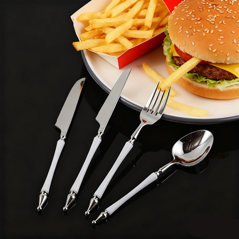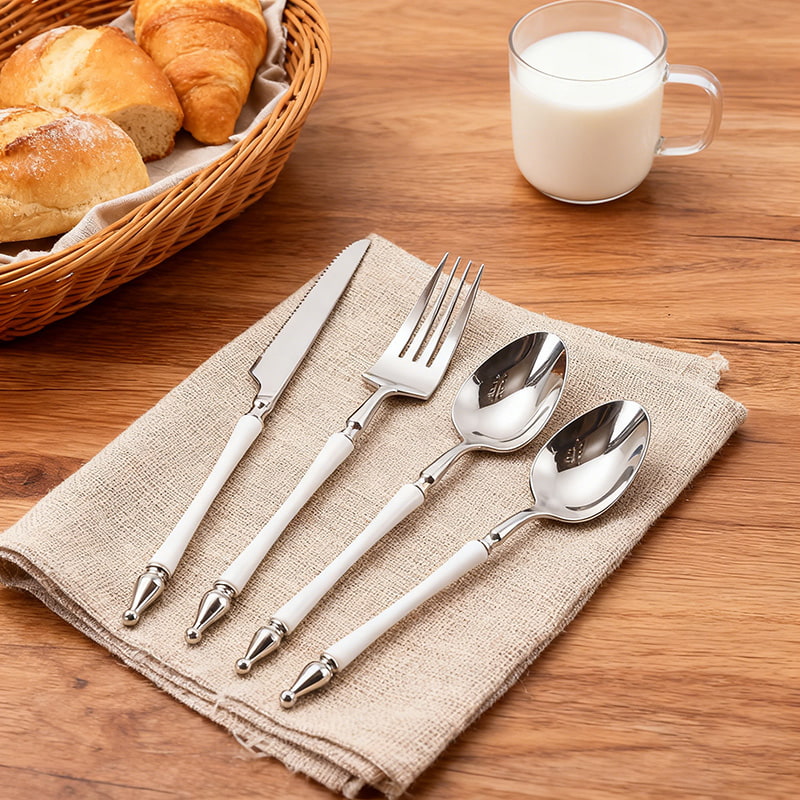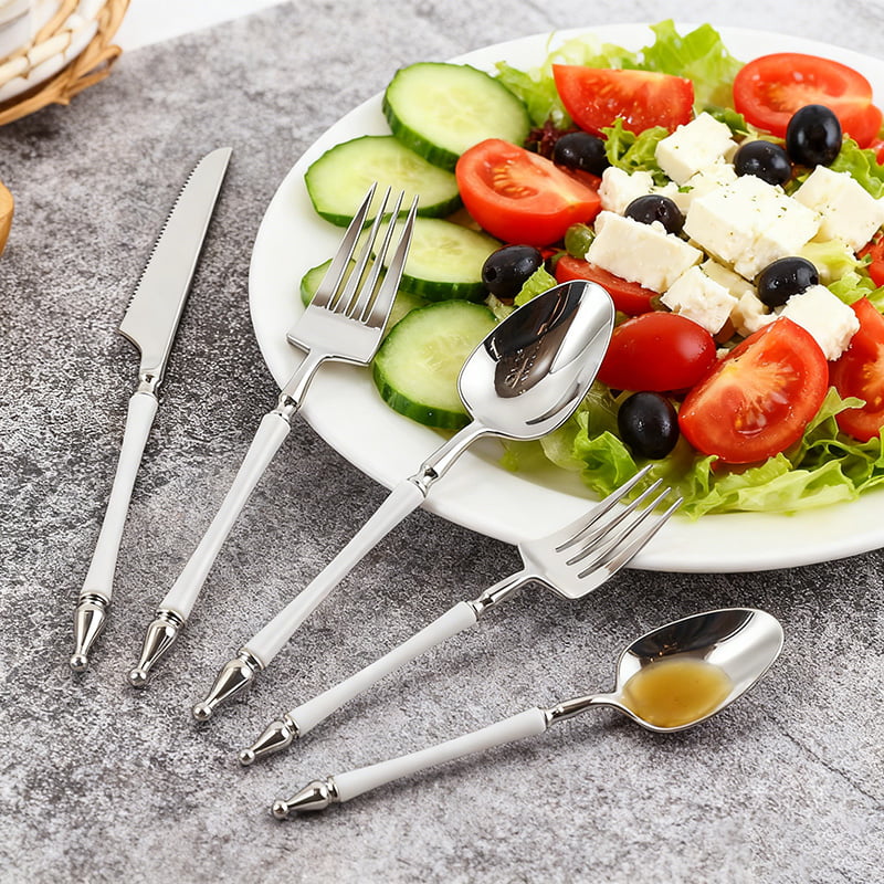 Polished silver-finished heads pair with crisp white handles for a timeless, refined look that elevates any table setting—perfect for vintage, modern, or romantic themes.