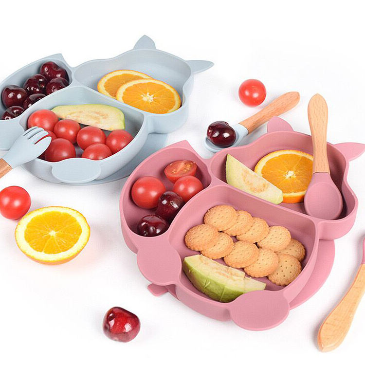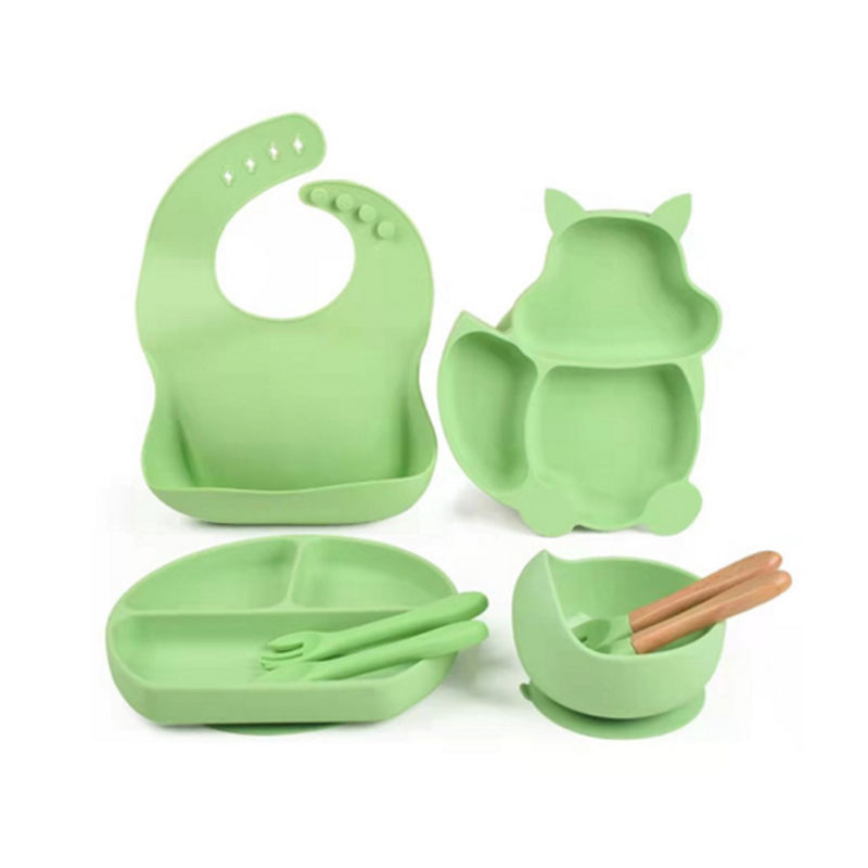 CustomizedConjunto completo de raposasInclui prato com ventosa, tigela com ventosa, babador de silicone, colher de madeira natural e talheres adicionais (colher e garfo).
