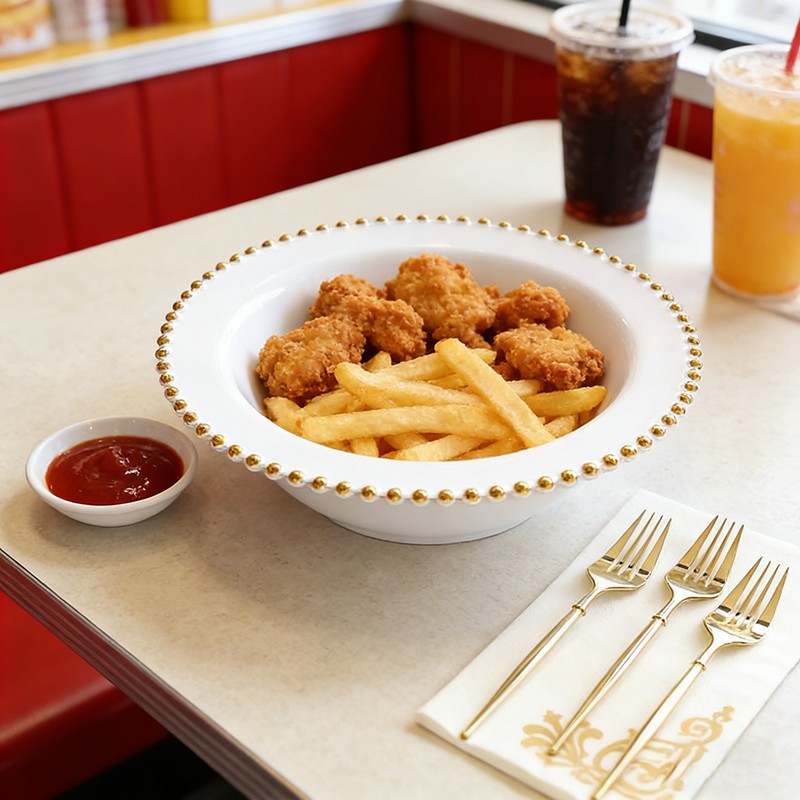 The handcrafted gold pearl beaded edge elevates the classic white bowl, turning casual picnics and formal weddings into elegant affairs.